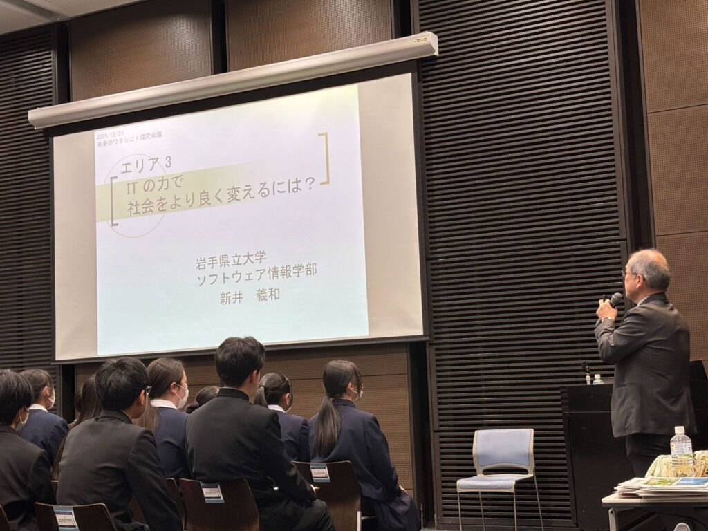 当イベントでは、まず岩手県立大学ソフトウェア情報学部の新井先生による講演がありました。