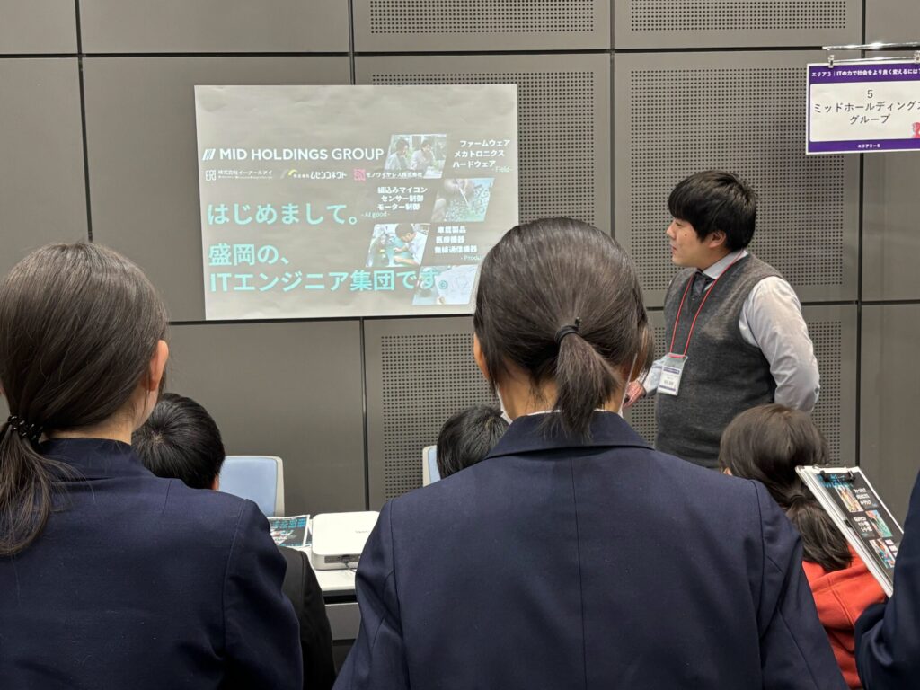 ミッドホールディングスのブースは「ITの力で社会をより良く変えるには?」がテーマのエリアでした。高校生のみなさんに「組込み」を知っていただき、「なんか面白いかも!」と思ってもらえるように、身近な製品を例に挙げながら「組込み開発」を説明しました。中には「組込み」を既に知っている学生さんがいたり、知らなくても興味を持って質問してくださる学生さんがいたり、わたしたちが日頃行っている「組込み」のシゴトを知っていただく良い機会となりました。