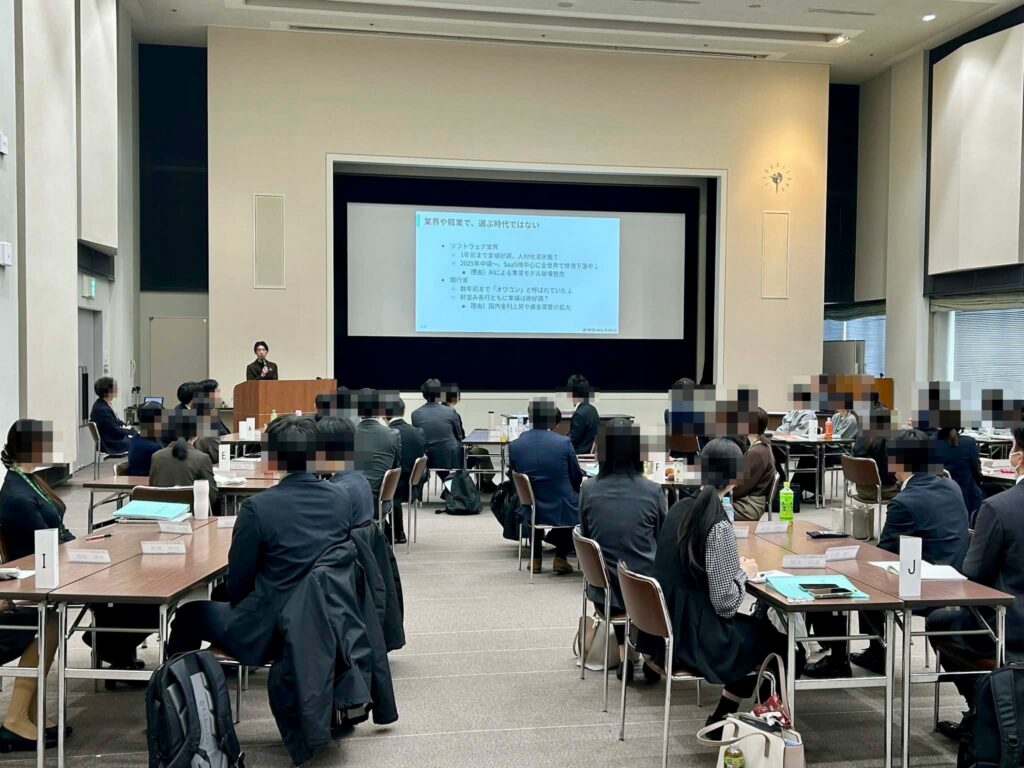 僭越ながら地元盛岡で働く経営者のひとりとして、自らの体験談や仕事への向き合い方などをお話し、最後に岩手の未来を担う若手行員の皆さんにエールを送らせていただきました。